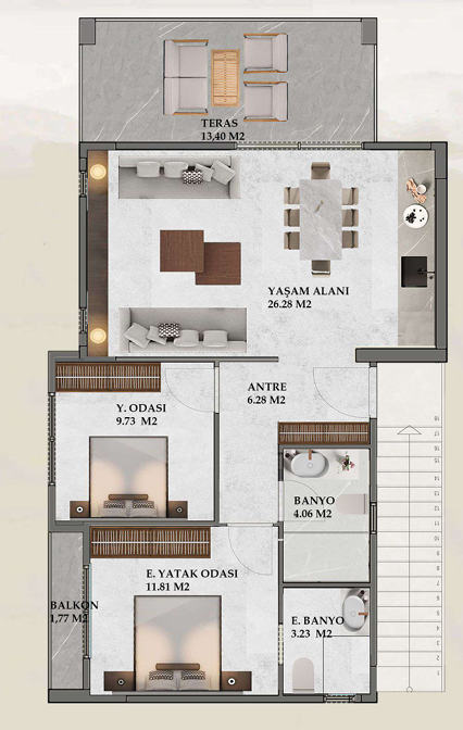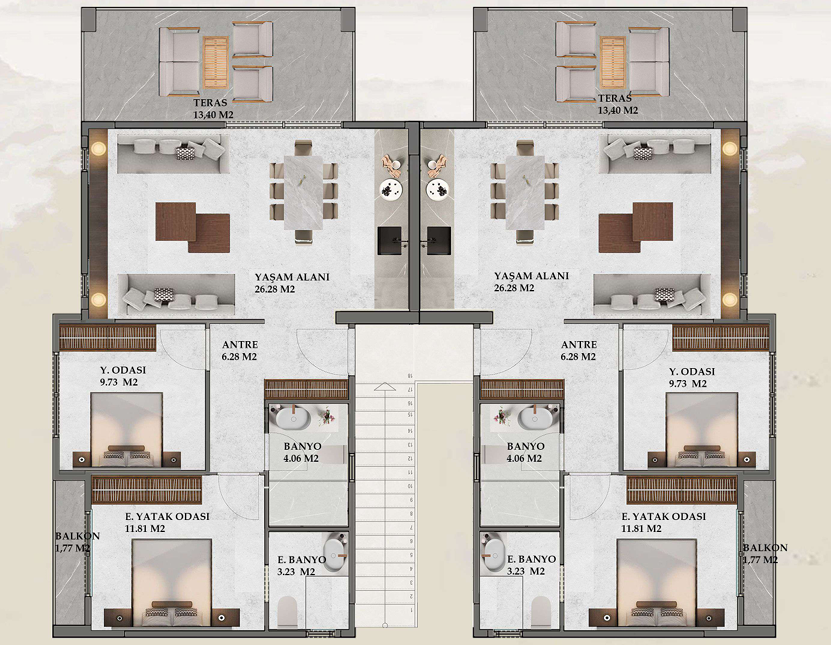 Her bir daire modern, fonksiyonel ve ferah bir şekilde tasarlanmıştır: