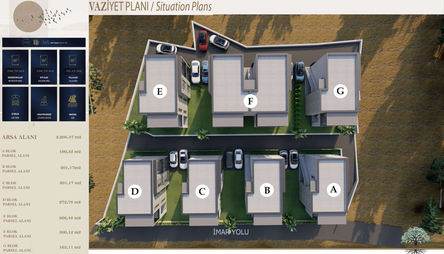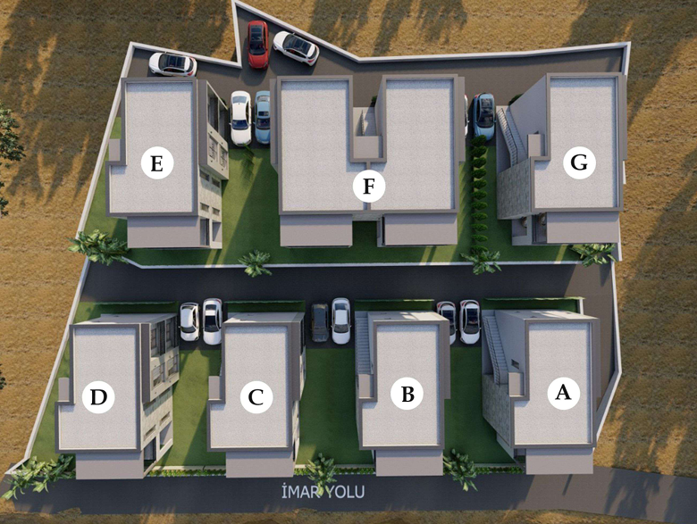 Proje, 7 blok ve 16 bağımsız daireden oluşmaktadır. Her daire 2+1 planında tasarlanmış olup, özel müstakil bahçe ve özel otopark alanına sahiptir. Ayrıca projede 60 m³ hacimli ortak su deposu bulunmaktadır.